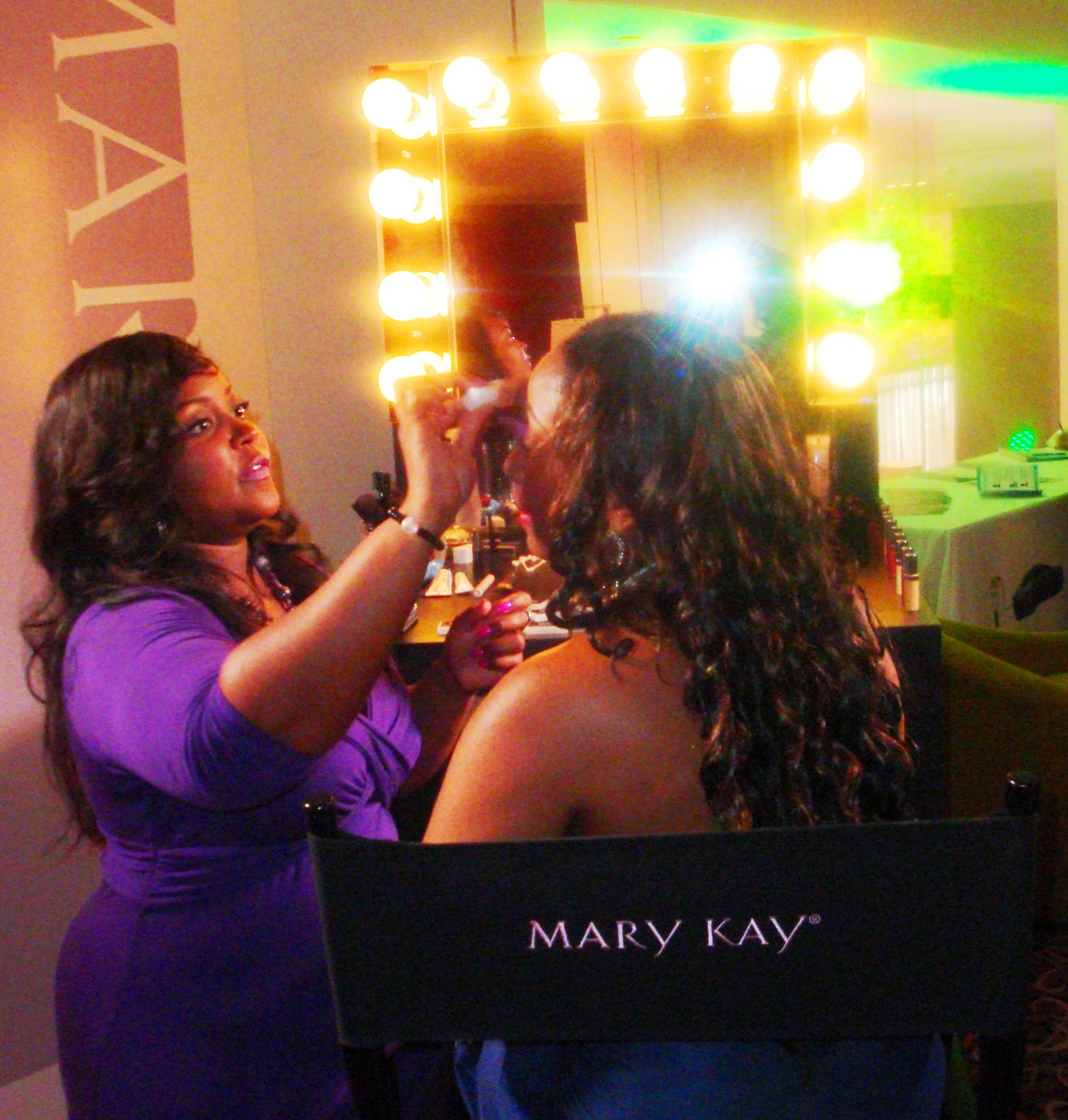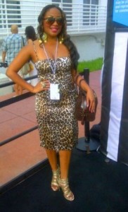 bracelets and necklaces displayed exotically colored stones which were hand made by jewelry designer Taryn Aronson of Jewels by Dunn. Taryn was witty and passionate as she explained her inspiration behind several of her pieces and the origin of the designs. After consuming the eye candy and engaging in a bit of photo booth fun, I was provided the opportunity to meet celebrity makeup artist Ashunta Sheriff. As I sat down in her beauty chair I felt like one of her notorious celebrity clients as camera crews captured her charismatically applying a mixture of two concealer colors under my eyes. She began to educate me on the importance of having the correct shade (to avoid raccoon eyes in photos) while discussing the products she used on her celebrity clients Jennifer Lopez, Marissa Tomei, and Alicia Keys. After being reminded of my time constraint by Sandra, I changed into a knee length leopard print dress from Cache with gold stiletto heels before darting to the Poko Pano Swimwear show by Paolo Robba. As I sipped on sweet coconut water I allowed my feet to relax into the sand inside the Oasis