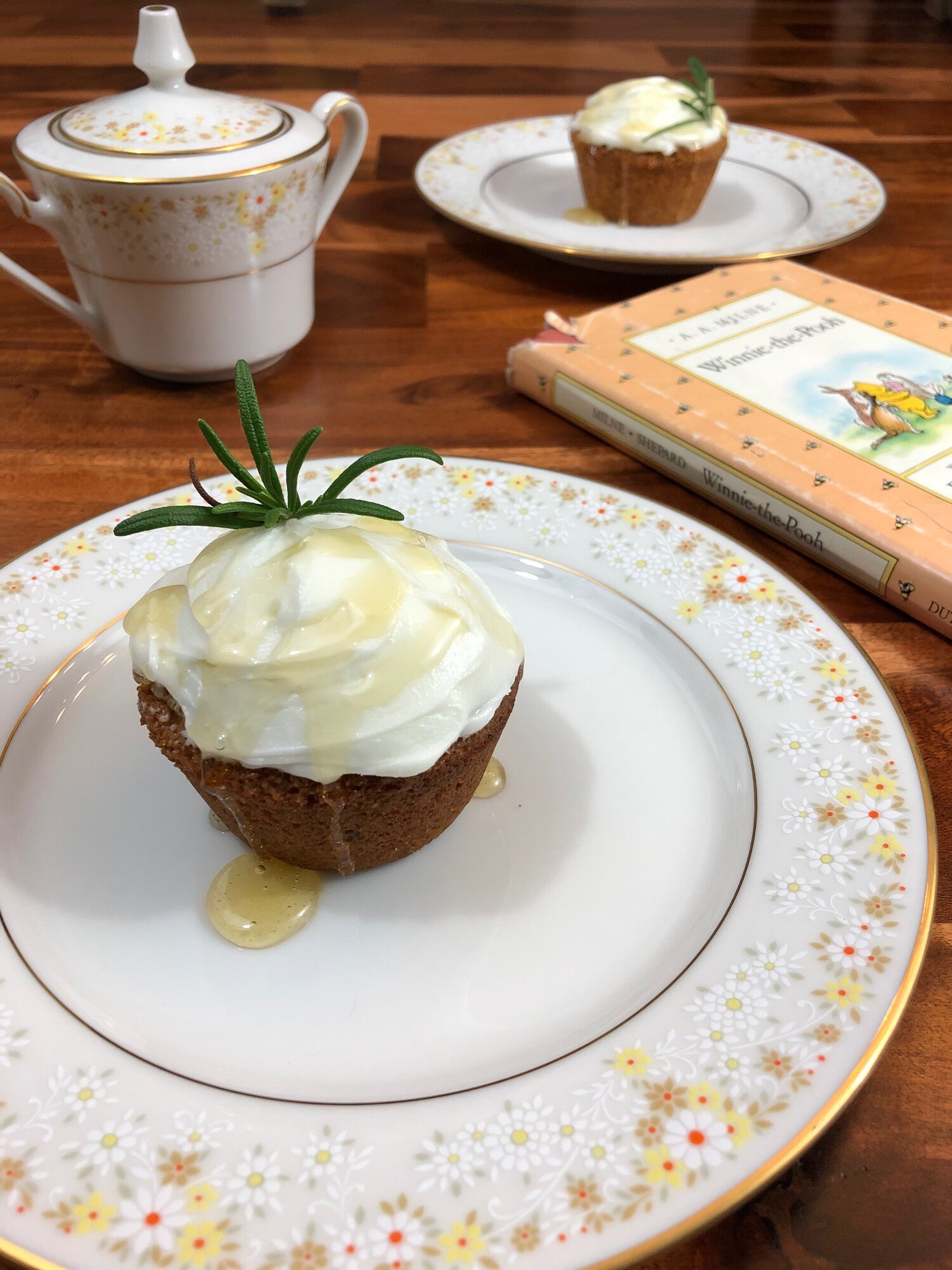 These “hunny” and rosemary cakes, topped with a billowy, cloud-like cream cheese frosting and drizzled with a rosemary honey, are inspired by Winnie-the-Pooh, and are perfect to share with your kids and grandkids. Who doesn’t have a soft spot for at least one of Christopher Robin’s childhood adventurer pals: Winnie-the-Pooh, Piglet, Eeyore, Rabbit, Kanga, Roo, and Owl? Given the opportunity, most people would scoop up that silly old bear and give him a big squeeze.